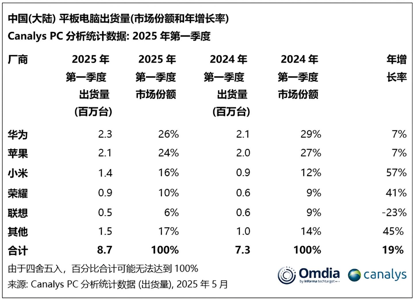 今日,市场调研机构Canals发布的最新数据显示,2025年第一季度,中国平板市场增长非常快,出货870万台,同比增长19%。